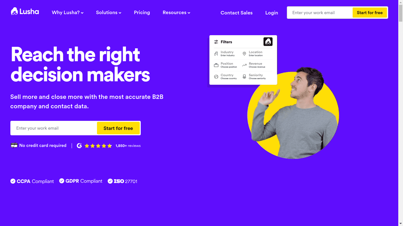 Lusha provides accurate B2B company and contact data to help you close more deals Reach your ideal customers with intent-based signals, job change alerts, and technology filters Enhance sales with globally compliant data trusted by 1M users Fill your pipeline with qualified leads based on buyer intent data Onboard your team in 10 minutes and prospect at scale right away
