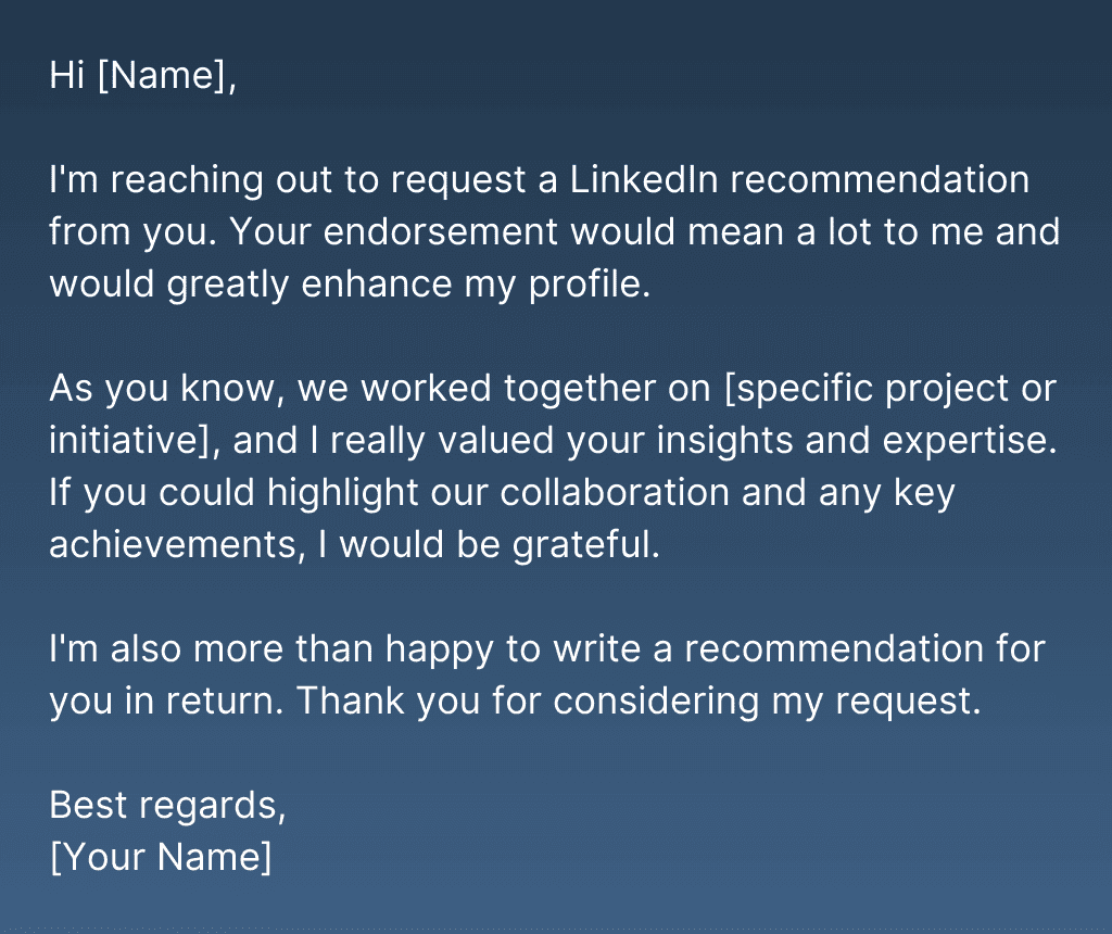 I’m reaching out to request a LinkedIn recommendation from you. Your endorsement would mean a lot to me and would greatly enhance my profile.