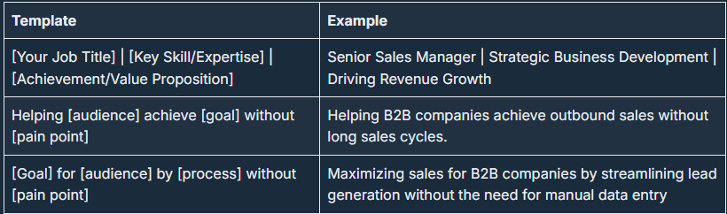 - Be Clear and Specific: Your headline should clearly state who you are and what you do. Use relevant keywords to make it easy for others to understand your expertise.