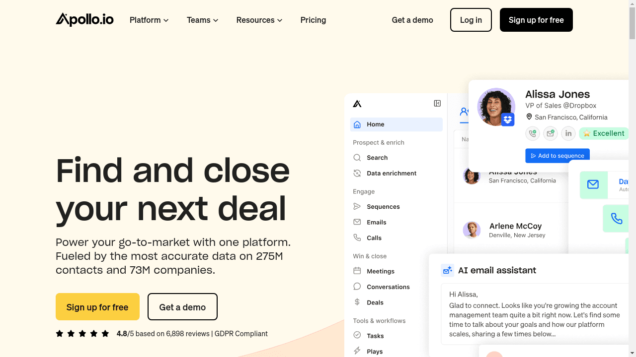 Apollo.io is a powerful platform for driving go-to-market strategies, offering accurate data on millions of contacts and companies. With a 4.8/5 rating from thousands of reviews, Apollo is GDPR compliant and trusted by sellers at over 500,000 companies.