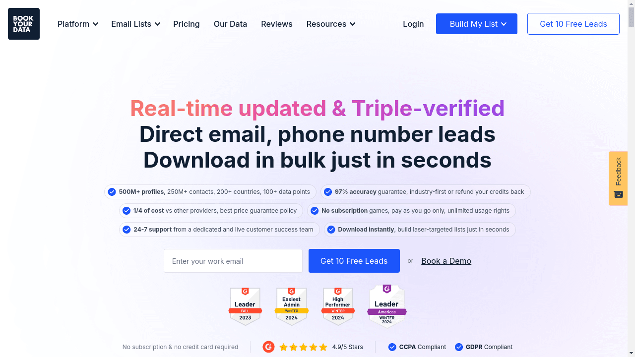 Their pay-as-you-go approach removes the need for expensive subscriptions, ensuring a more efficient lead generation ROI. Bookyourdata goes a step further by providing real-time email verification, access to over 100 data attributes, and customizable lead filtering options.