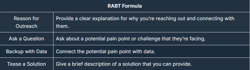 Moreover, high-quality and straightforward messages are a great way to connect with prospects. Here’s a formula by JB Jezequel called the RABT formula. This template is a cool approach for your cold outreach.