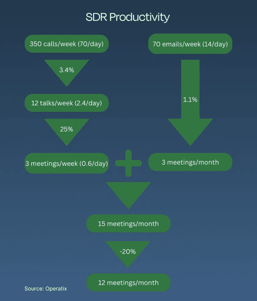 Additionally, here’s a sample breakdown of SDR productivity that you can use as a baseline for your team. This is the baseline expectation of productivity levels for SDRs. It takes into account average callbacks and reply rates. Lastly, it considers an average 20% dropout rate for scheduled meetings.